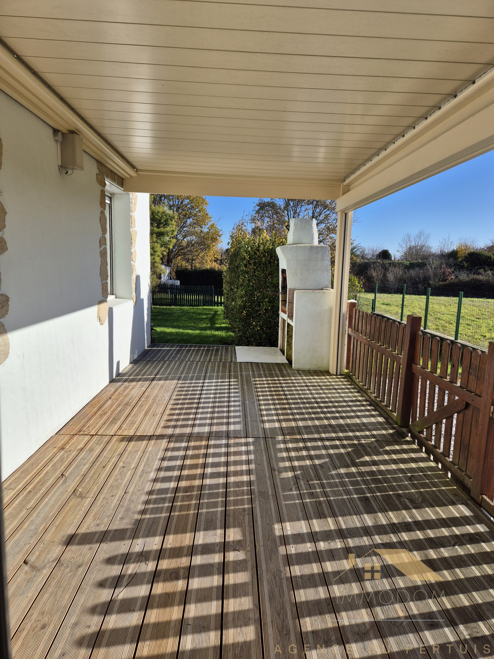 Terrasse couverte pergola bio climatique exposée SUD avec barbecue.