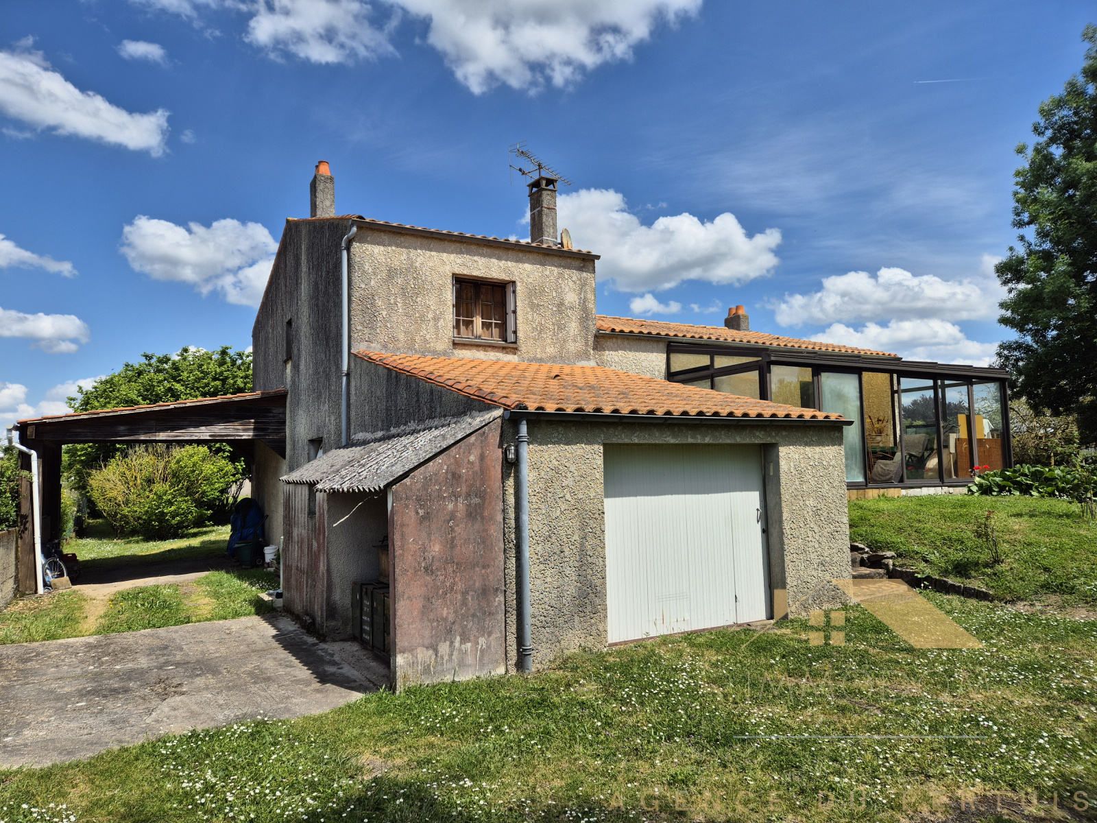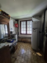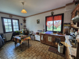 Quartier calme - Maison d'habitation à rafraichir d'environ 111 m² : entrée avec placards, cuisine aménagée et équipée, salon-séjour avec cheminée, véranda, dégagement, salle de bains, wc. En demi-étage : 2 chambres et wc.
