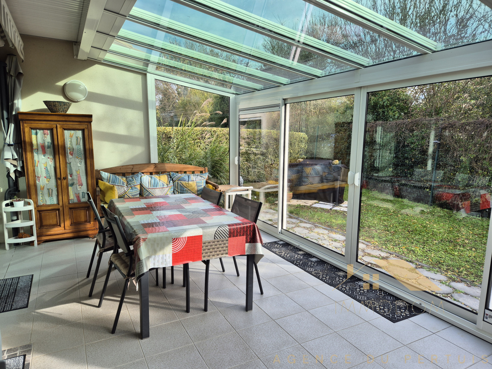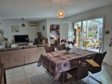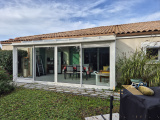 Maison de plain-pied, construction de 2013, comprenant deux chambres dont une avec placard, dégagement avec dressing, wc séparé avec coin buanderie, salle d'eau, pièce de vie salon-séjour, cuisine aménagée et équipée + cellier (4m²) + Véranda (18m² ) exposée SUD-EST.